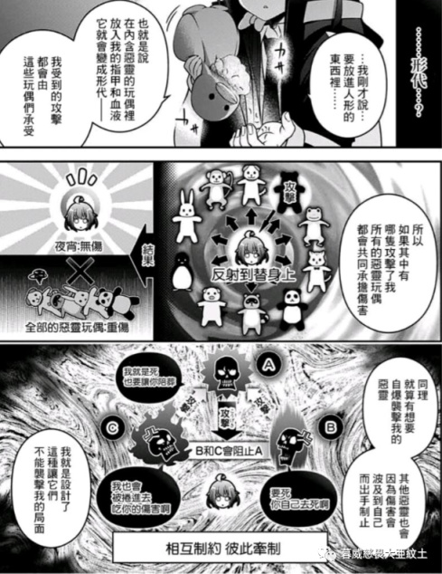 至于这本漫画为什么会被称为暗黑系/恶灵系宝可梦?首先要提及的是一个核心的设定:形代,只要把自己身体的一部分放进幽灵附身的玩偶里,那么自己受到幽灵的攻击时就会辐射在幽灵玩偶身上,让幽灵不敢攻击本体。