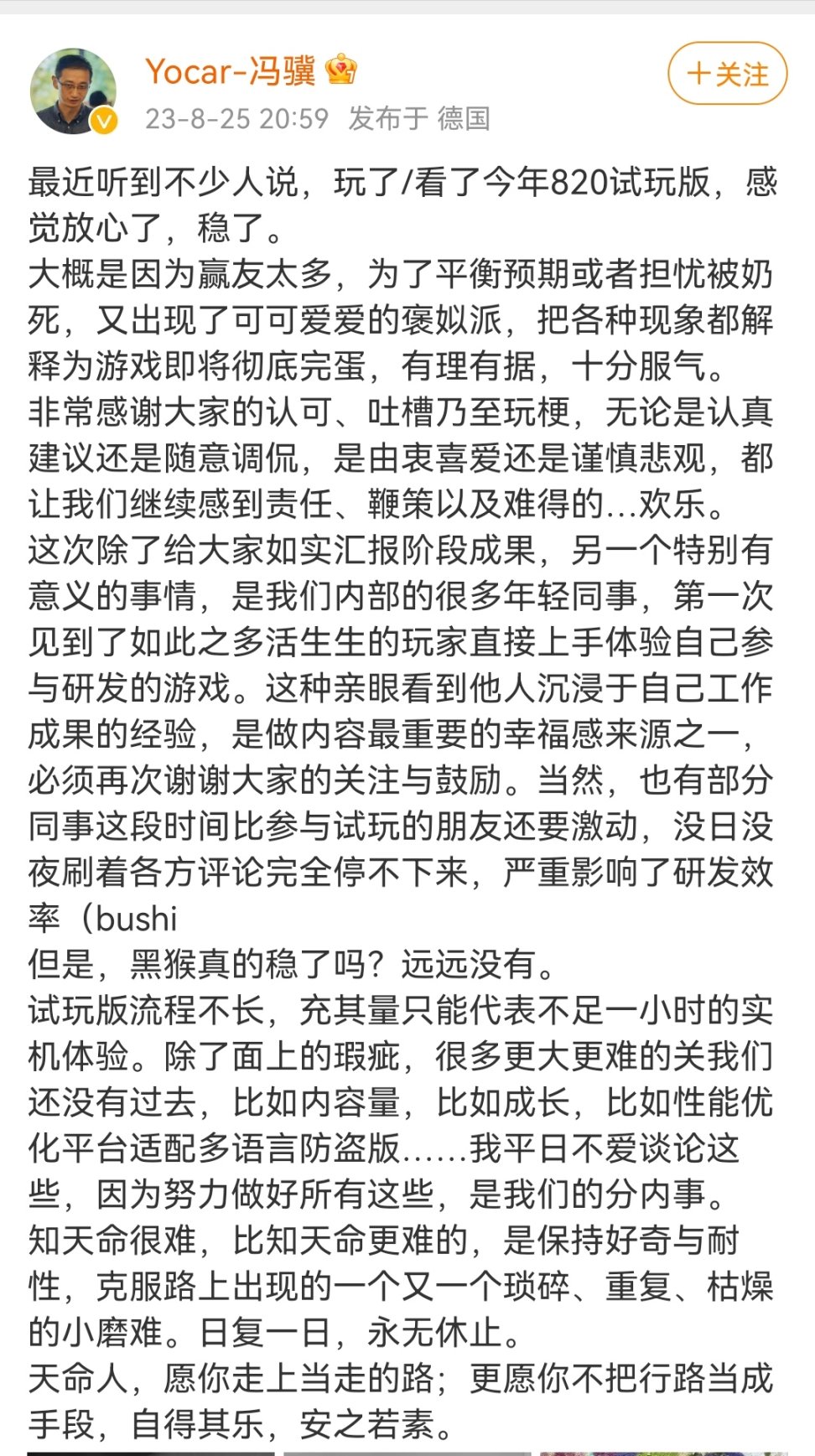 此前,在科隆游戏展大火之后,《黑神话悟空》主创冯骥也曾发长文表示,项目组内许多年轻同时是第一次见到了如此多的玩家直接上手体验自己参与研发的游戏,体会到了非常大的幸福感。