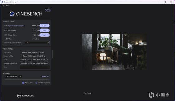 默认情况下i7 13700KF 在CINEBENCH 2024中的测试结果GPU 9556分、CPU多核1711分、CPU单核123分