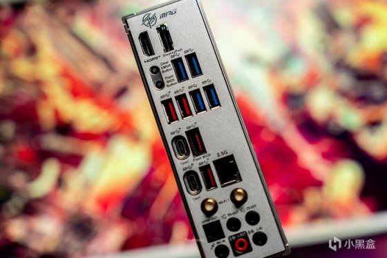 从上至下依次为集显的DP1.4、HDMI2.1、Clear CMOS、FLASH BIOS、4个蓝色的USB3.2 GEN1 5Gbps、4个红色的USB3.2 GEN2 10Gbps、1个TYPE-C USB3.2 GEN2 10G、1个TYPE-C USB3.2 GEN2X2 20G、一个2.5G LAN 、WIFI 7 双天线接口、音频输入输出口