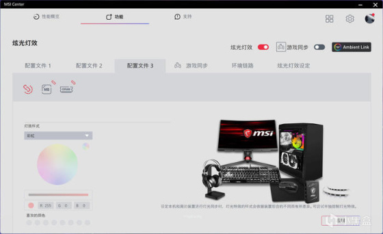 MSI CENTER 提供非常多的模块可供选择DIY,包括灯效、智能优先级、游戏助手、快充、显示真彩视界、场景设置等等