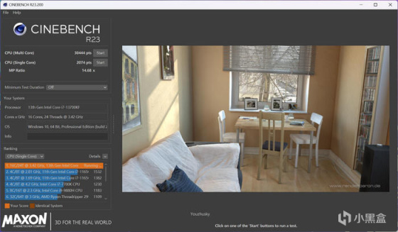 CINEBENCH R23 测试CPU多核 30444分、CPU单核 2074分
