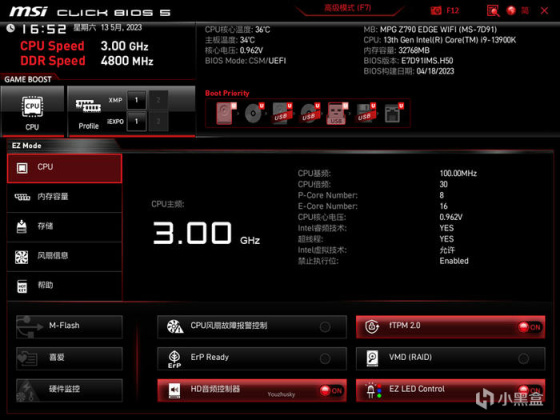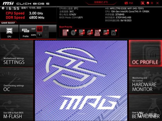 主板的默认CMOS界面,简易模式还是很直观的看到了CMOS的所有功能,顶部的检测信息显示,中间的CPU BOOST、内存XMP、启动顺序等,主区的CPU内存存储风扇等罗列,最后底部的M-FLASH、监控、LED等