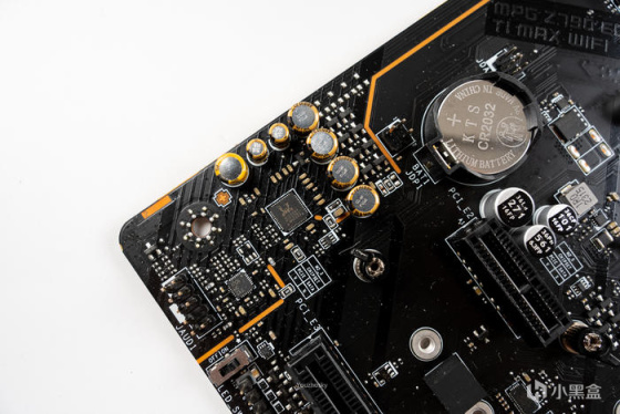 左下角的声卡区域,隔离的PCB部分,主板仅有的几颗电解电容也是为了更好得发挥REALTEK ALC4080声卡的性能,边角上还有一个6层PCB的标识