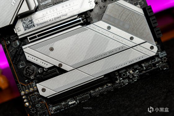 整块主板的PCIe区域,而因为支持5个M.2插槽和5个冰霜铠甲,散热规模几乎覆盖了整个PCIe区域,而第一条PCIE X16为5.0规格,并且带钢铁装甲加固,第二条为PCIE 3.0 X1,第三条全长为PCIe4.0 X4