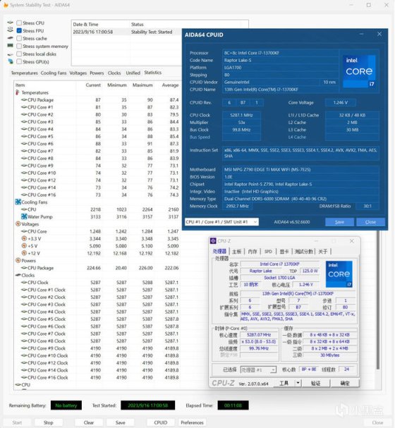 13700KF在该平台上使用九州风神冰堡垒360青春数显版默认情况下烤机11分钟为最高87°,大核与小核都没有出现降频的情况