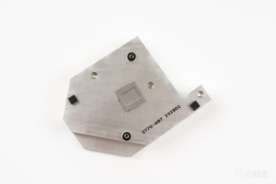 芯片组散热片与芯片组通过导热垫接触,两颗螺丝固定和两个脚垫辅助支撑,右下角有物料号