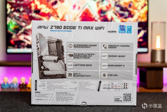 包装的背面依旧是网纹白底,中间的主板图案以及主板八大功能特点,当然最主要的还是16相供电的升级以及Linghting GEN5、WIFI7和蓝牙5.4的功能