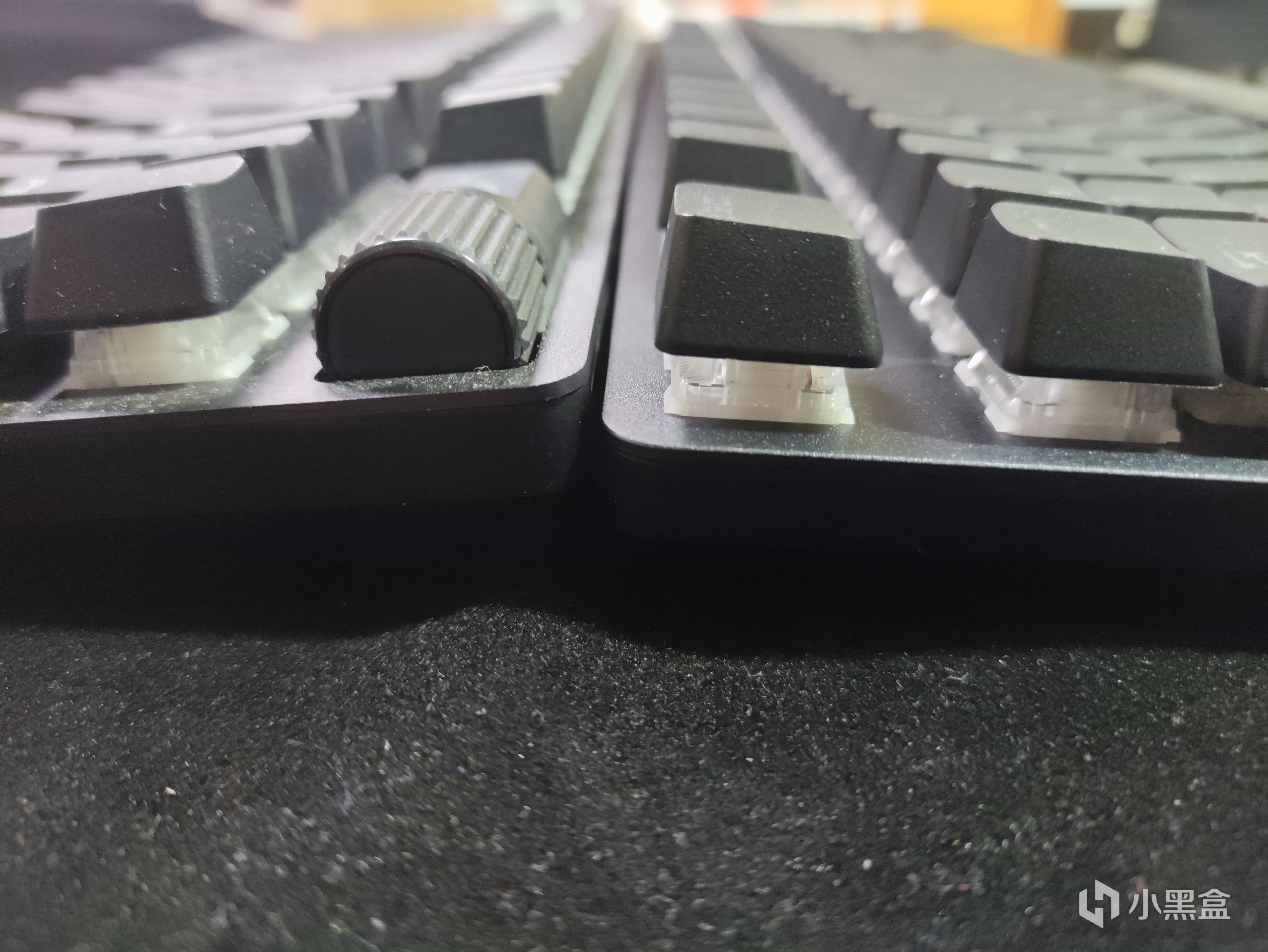 从侧面看,可以看出98比104厚了不止一点,因为98在底部凸出来一块放电池,所以虽然在规格参数上键盘厚度只差了3mm,但是上手体验能感觉到两个实际厚度相差很多。