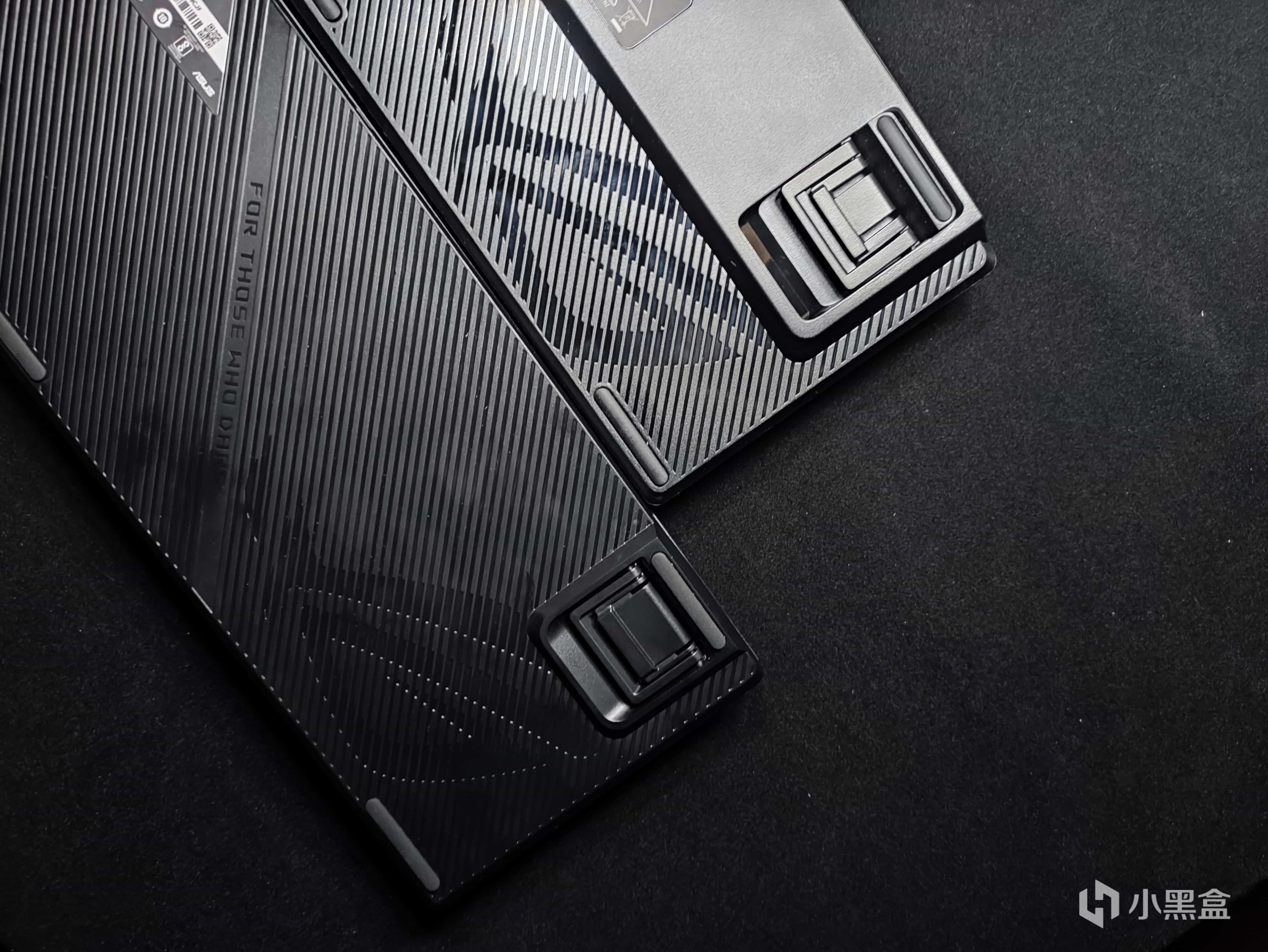 来到键盘的背面,可以明显看出98凸出来一块,都有熟悉的ROG大眼睛纹路。