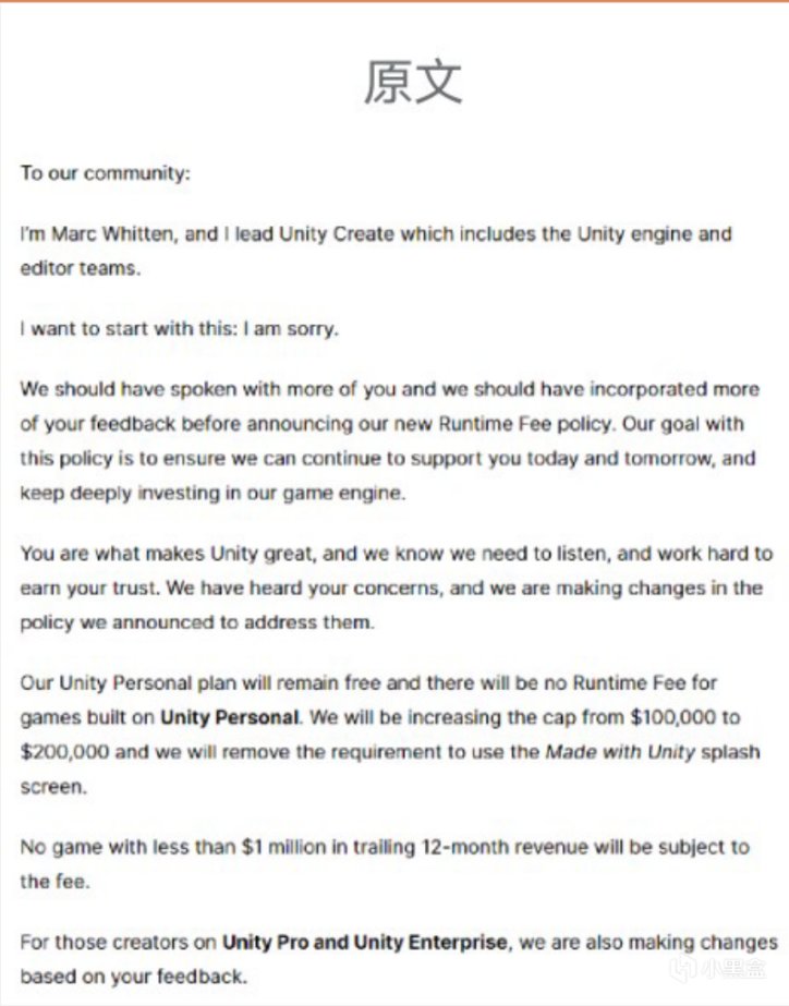 而今(23)日,官方发表最新公开信,向所有社群致歉,同时更新相关政策。「我想以『对不起』作为文章的开头。」 Unity 创意部门总经理Marc Whitten表示:”我们在公布新的收费政策之前,应该与更多人交谈,以吸收更多的回馈。 我们制定此政策的目标是希望能确保今天和明天能继续为您提供支持,并深入投资游戏引擎。”
