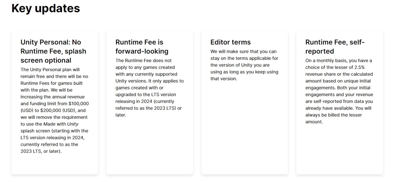 Unity震惊游戏界的新收费规则将收取过去开发者额外费用,导致开发者们的强力反对呛声下架游戏,在经过官方道歉听取社群意见后推出了新的收费方案,将不会朔及既往对以前的开发者收费、提高个人计划资金门槛与两种适用计划,对于此新计划公告,多数开发者都还算是满意予以正面回应,要是早点讲好也不用造成这么多麻烦,但也很多人提到2024新版本之后对Unity信心已经难以恢复,都可能需要一个备用计划以免再度出包。