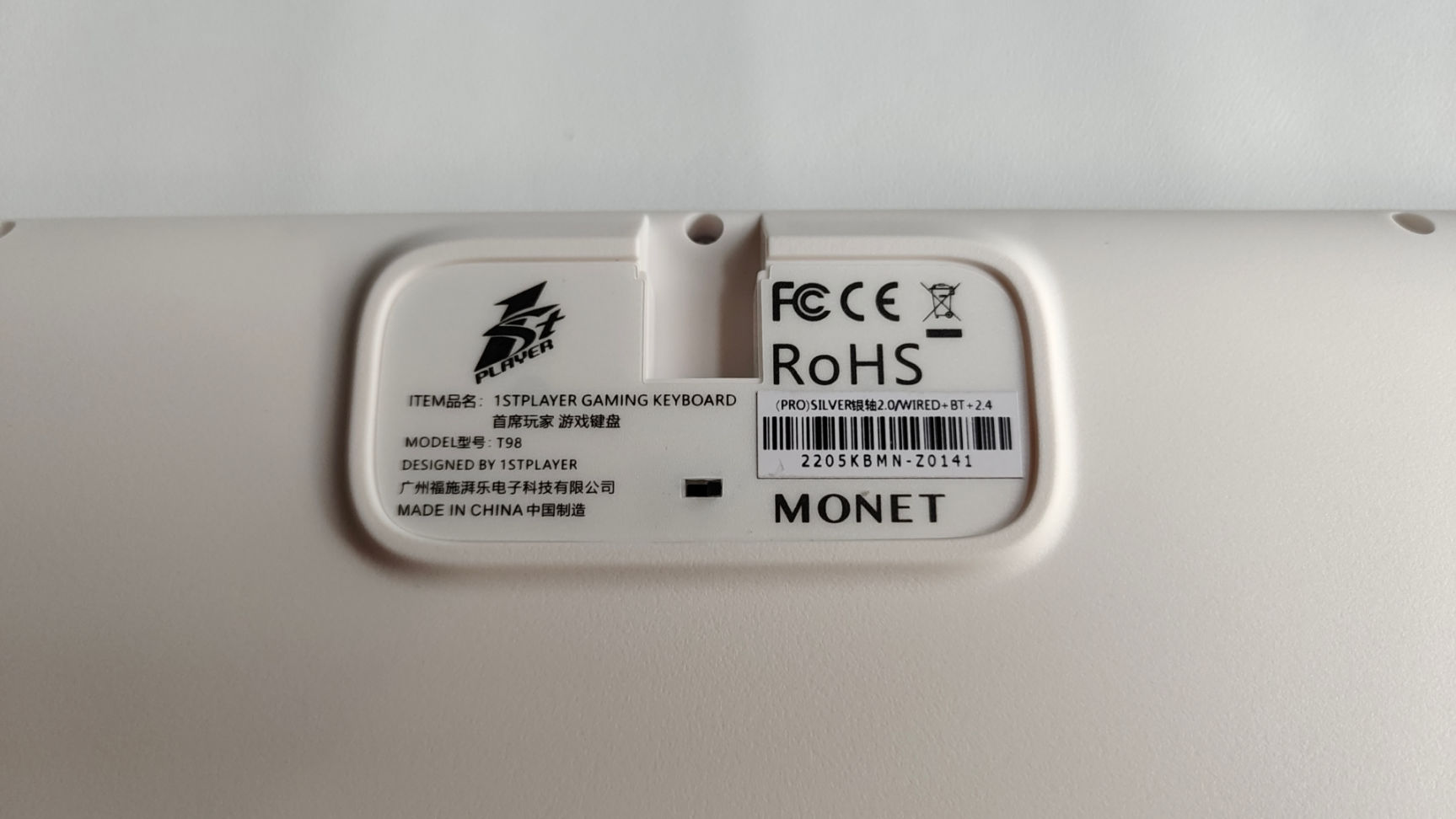 这把T98和RX980是同一个问题,把2.4G接收器放到了铭牌底下 但铭牌不是在中间,是在C口出线口,就很离谱