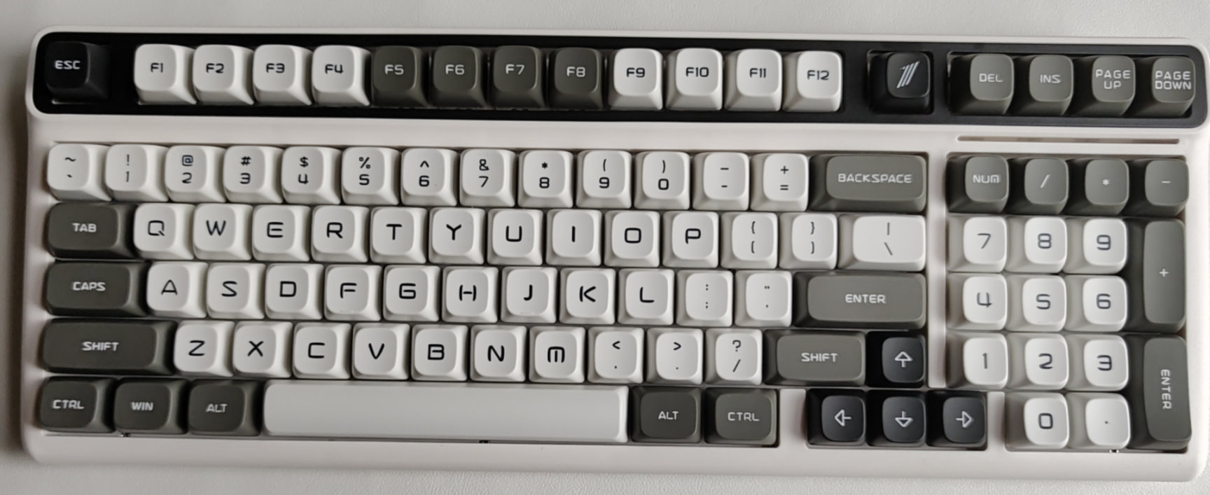 我手上这把键帽是白色+灰色+黑色的一个混搭配色,类似熊猫色,键盘实际看起来还是非常不错的属于低调有内涵,甚至书生气有点重的一个配色。