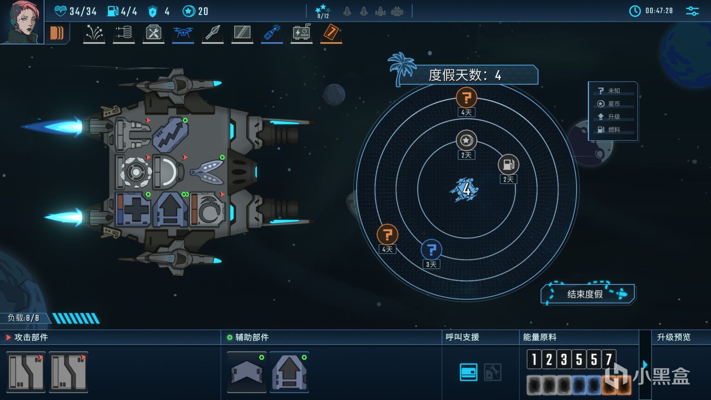 在3个关卡中,随着战斗的推进,会赢来越来越长的度假时间。度假时可选宝物、燃料、部件、修复等,还有随机的问号,此外可以根据白色、蓝色和橙色判定互动点的品质,每次战斗期间可以尽量用度假来强化和调整战斗力。