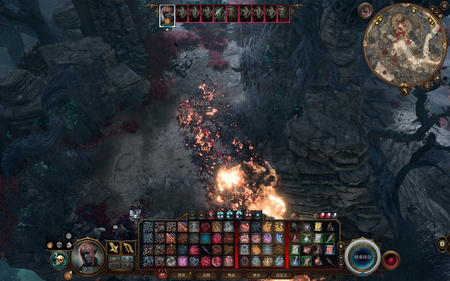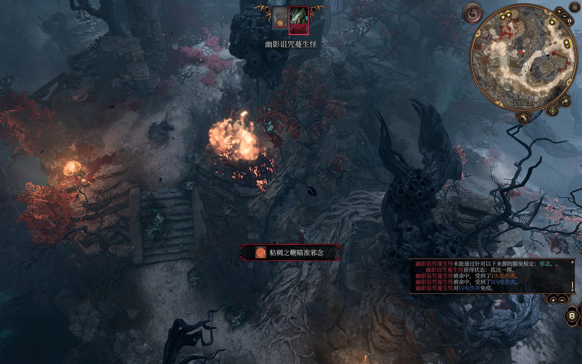 唯一需要注意的是这只两百血的藤蔓大怪,我们目前利用生离死别附伤也很难一轮打出200伤害,先用火墙术和火球术清光其他小怪,最后再来对付它。我们跑到这个位置,你会发现它不会跑下来,它固定会到这个位置用粘稠之鞭拉你,但这个位置被墙体阻隔,你豁免失败也不会被拉过去,然后就能在这个地方疯狂输出它。