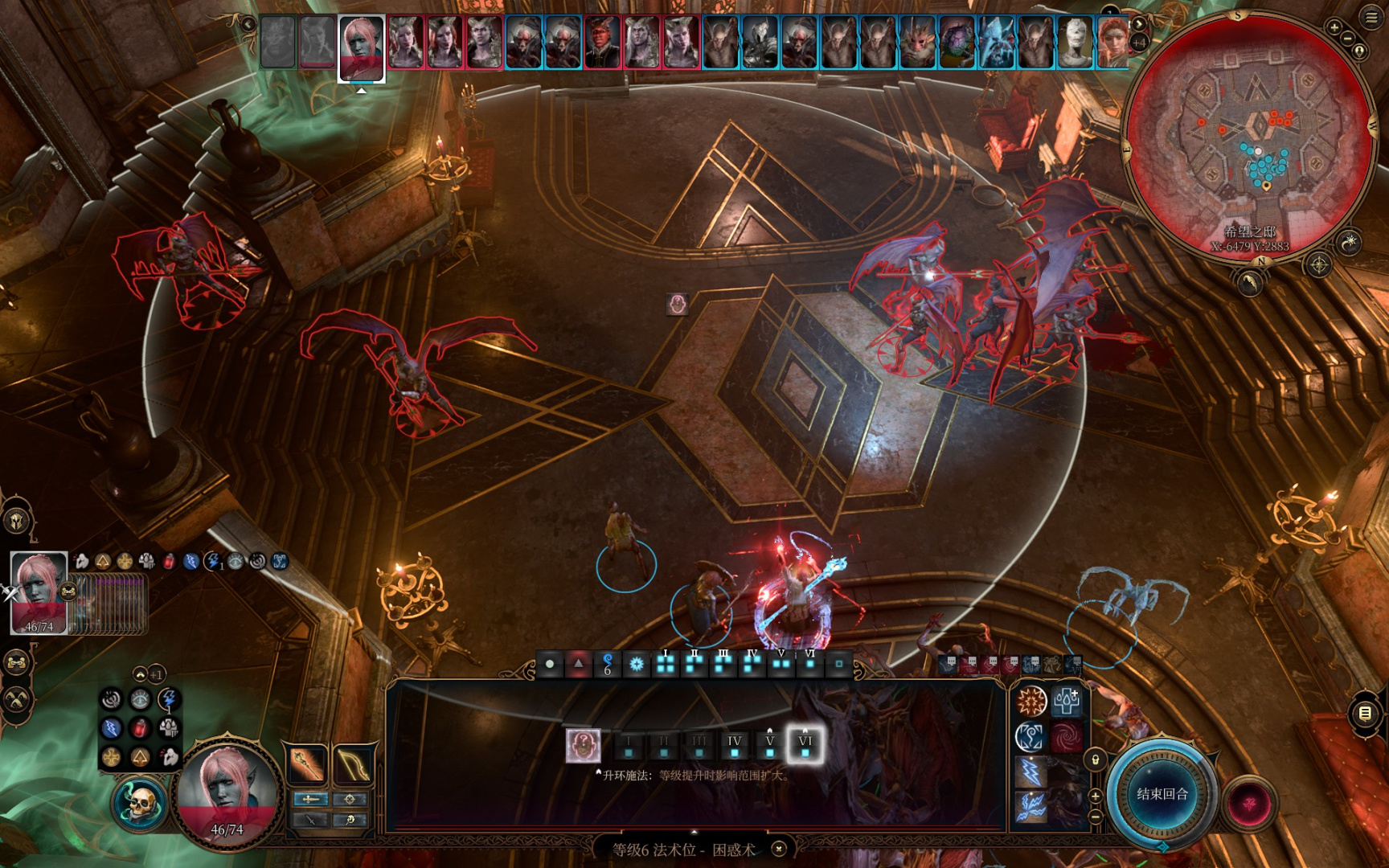 先召唤出我们的召唤物喝嗜血灵药,战前不要放加速术,我们没有专注位给加速术。开局先用黑洞聚怪,然后用六环的困惑术控住全部敌人,轮到希望的回合放逐一个血量最多的坎比翁。不动决心对困惑术无效,只对定身类技能有用。敌方在困惑术持续时间内都会狗咬狗,两回合足够我们清光其他坎比翁,再过一个回合我们就把拉斐尔包围了。