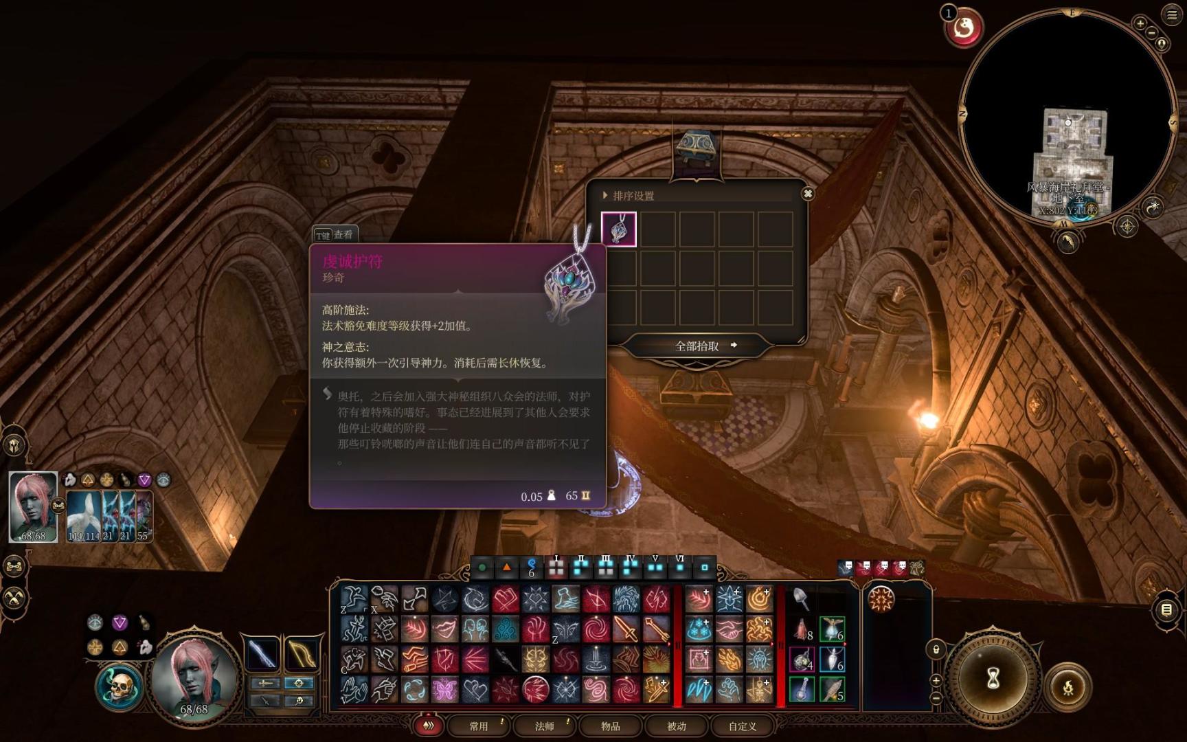 到飞龙关南翼之后,如果不想打戈塔什可以和他合作,不建议现在打我们处理不了那么多钢铁守卫。地牢的高精灵顾问可以顺手救了,焰拳盟友的战斗力还不错。我的经验值刚好升11,六环法术学唤起死灵和法术无效结界,木乃伊更新之后可以跳了,比之前聪明不少。剩下法术的可以跑到博德之门的巫术杂货店买,进了博德之门直奔风暴海岸礼堂,直接干死神父偷吃贡品。拿到+2DC项链,现在我们可以把心灵火花换下来了。