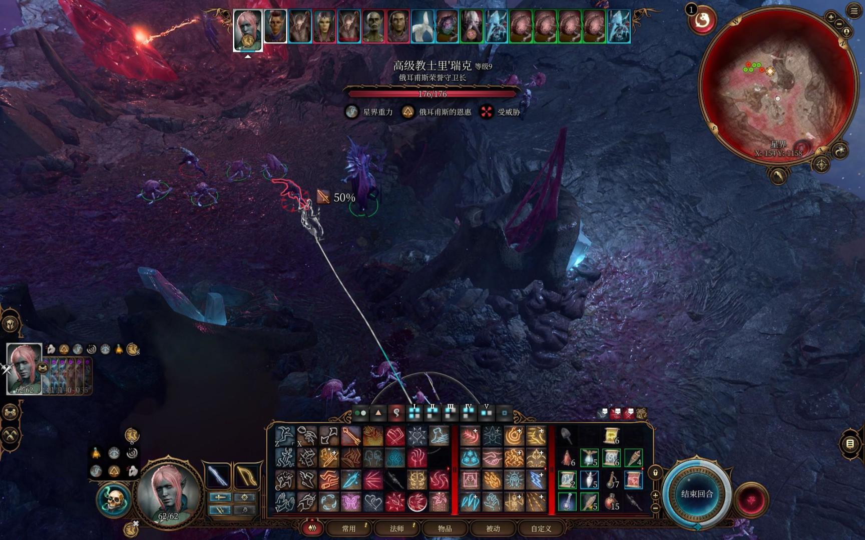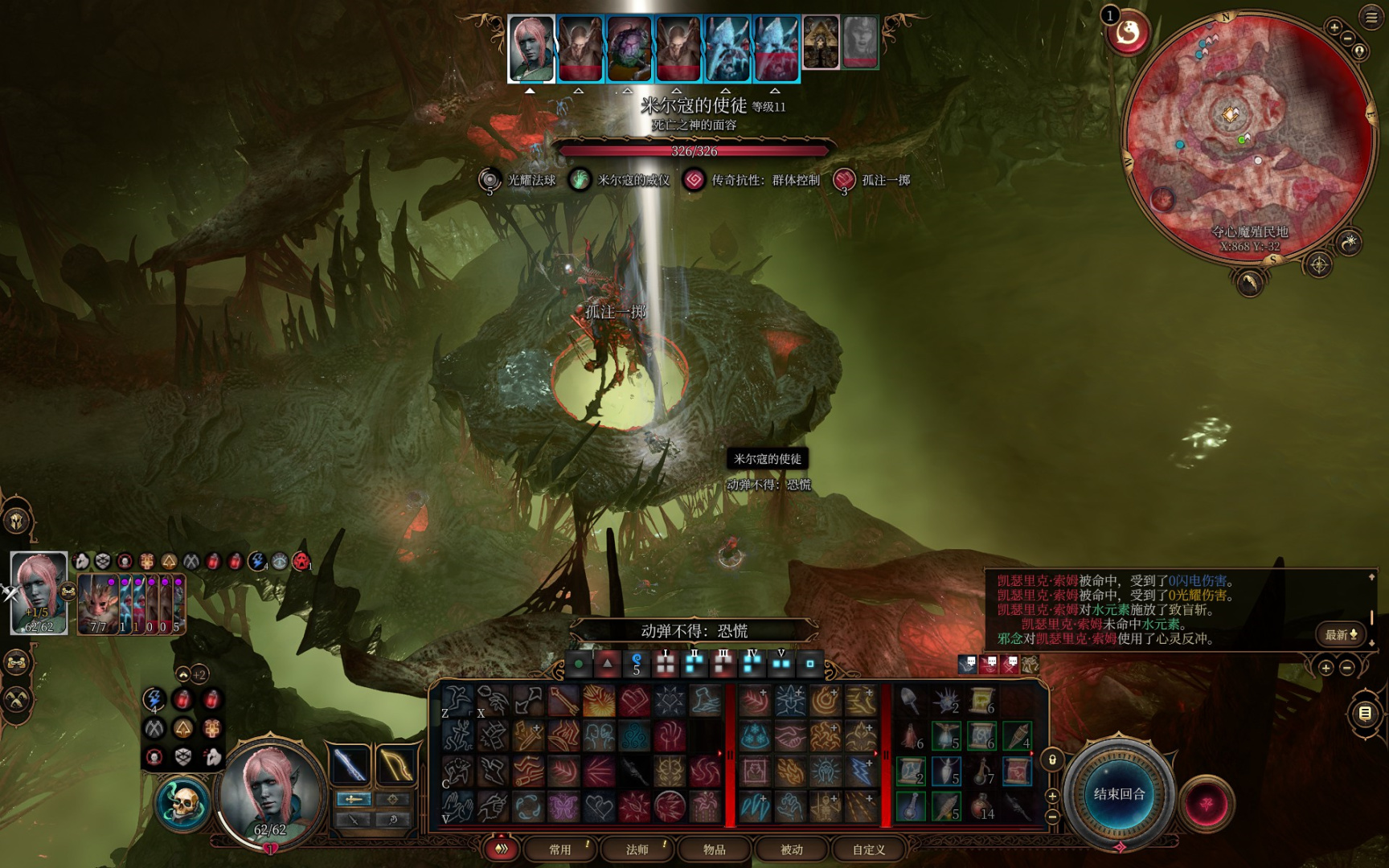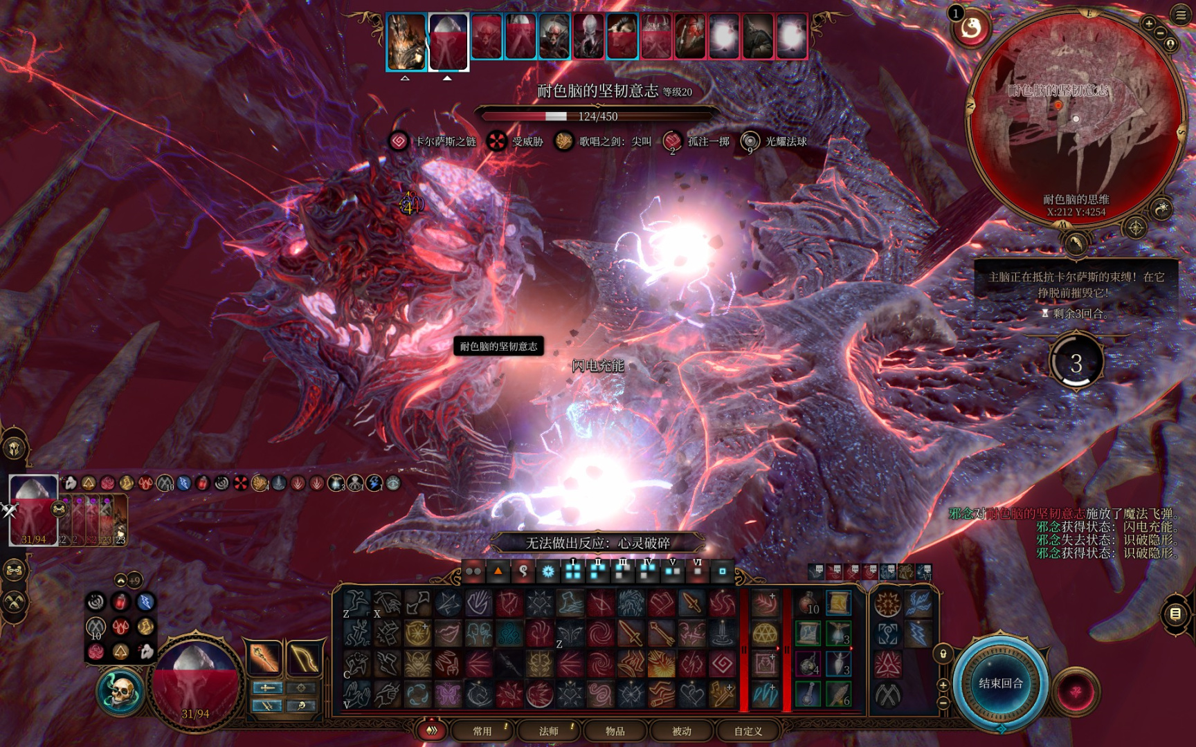主角一个火球术解决四个噬脑怪,触发嗜血灵药效果获得一动,再喝一个速度之油,两次三环法术飞弹秒掉夺心魔。场面直接大幅简化,接下来慢慢用一环的法术飞弹磨将军的血,顺带给它叠debuff光耀法球。闪光戒指的光耀法球最高叠七层,可以让对方命中-7,接下来就等艾琳把将军干掉进二阶段了,一个至圣斩差不多就能带走。