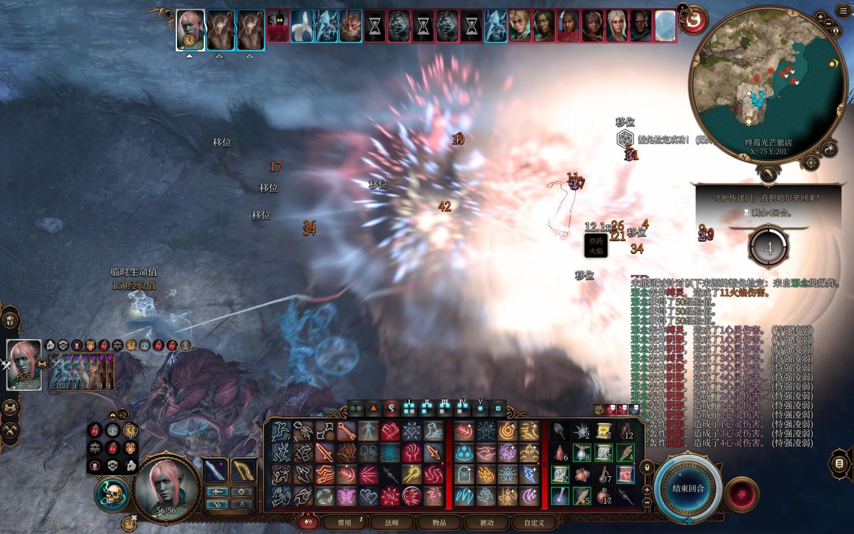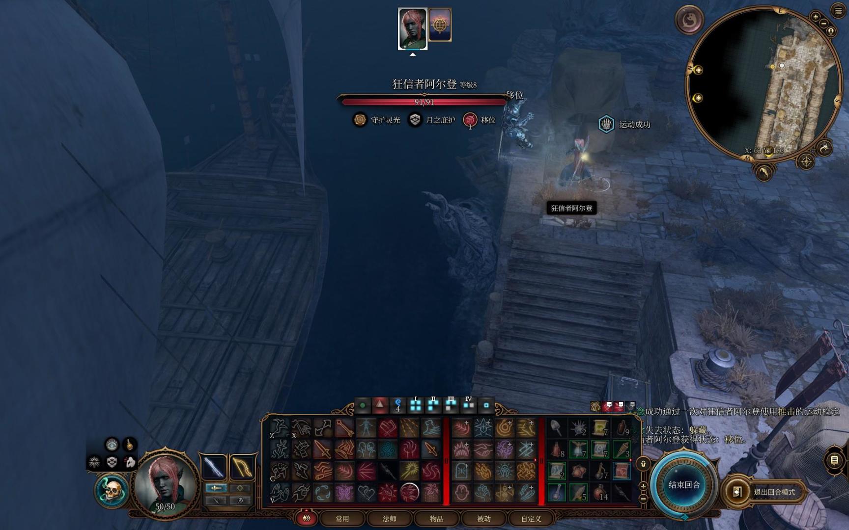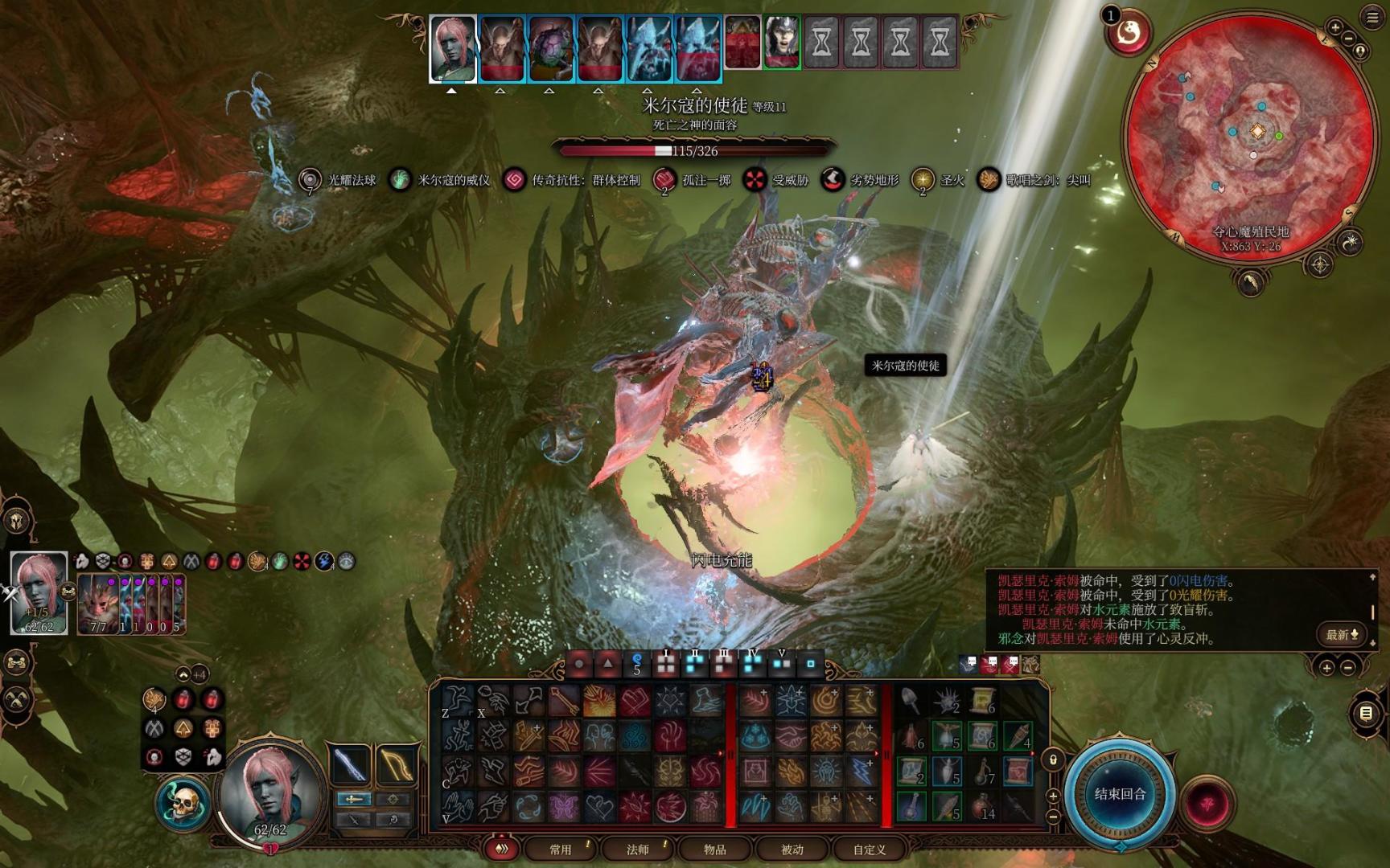 主角一个火球术解决四个噬脑怪,触发嗜血灵药效果获得一动,再喝一个速度之油,两次三环法术飞弹秒掉夺心魔。场面直接大幅简化,接下来慢慢用一环的法术飞弹磨将军的血,顺带给它叠debuff光耀法球。闪光戒指的光耀法球最高叠七层,可以让对方命中-7,接下来就等艾琳把将军干掉进二阶段了,一个至圣斩差不多就能带走。