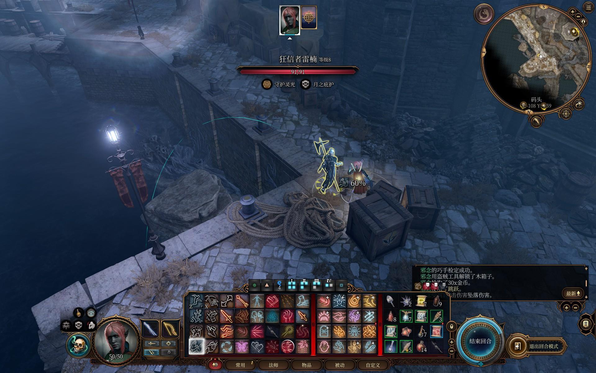 基本清完图后来到月出之塔,正门的两个守卫可以用火墙术直接干掉,他们身上有两条蝌蚪,现在随便解锁什么灵能都无所谓。穿过地下监狱来到港口,准备拿港口的蝌蚪和经验。港口有四个敌人,可以直接利用地形干掉三个。不过雷鸣波很难推动他们,所以先喝一个云巨人力量药剂,然后把守卫一个个推下去秒杀。最后剩一个三十多血的侍僧直接开打,拿到罐子里的两条蝌蚪,继续点两点灵能。