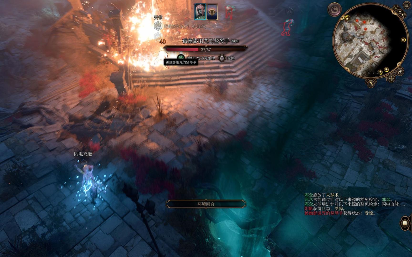 此战对我们威胁最大的是两波缚灵,在缚灵要出现的地方放上全部爆炸物,我个人还剩三个油桶和一个储液罐,足够秒第一波缚灵。开战之前给自己上一个加速术,磕了嗜血灵药后我们每回合都能放三次法术,用范围更大的冰风暴清除小怪。