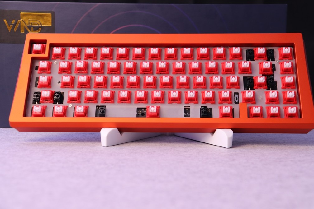 无棉gasket的手感搭配1.6mm不开槽PCB,同时棉条搭配多点位对于这块较小的PCB而言是一个相对致密的压缩,按压时候有些许弯曲,韧弹但并不塌陷。而top铝定相对手感就比较传统的,不过同样的配置比我组过的一些老TOP声音表现要响亮不少。