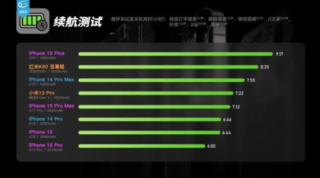 针对续航性能部分,「极客湾」表示功耗不好就是会直接影响续航力,搭载A17 Pro的两款iPhone续航表现都退步不少,经过他们所制定的续航模型测试,iPhone 15 Pro Max的续航时间比上一代减少了40分钟,而iPhone 15 Pro的续航时间则仅剩下6个小时。显见虽然芯片升级,但也因为功耗拉高影响了手机的续航力, 表现不如预期的iPhone 15,着实也让不少3C科技影音创作者都有些意外。 不过iPhone 15 Plus的续航表现还行,尽管电池容量并没有更大,但续航时间比Pro Max多出2个小时。