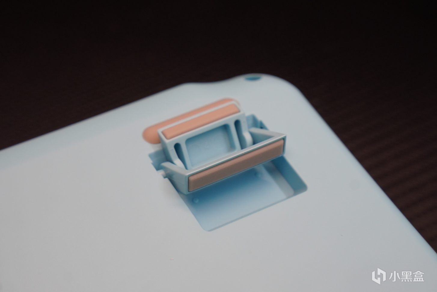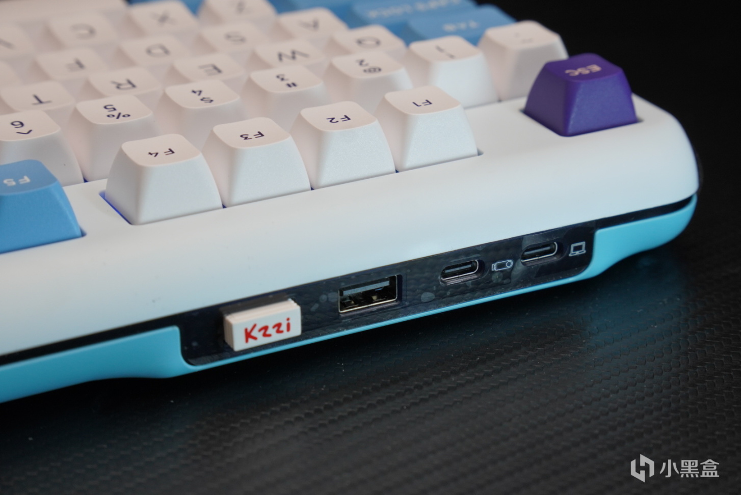 键盘的左上方是键盘的连接口,收纳仓以及拓展HUB,啥意思呢,就是在有线模式下连接电脑,旁边的口你可以插u盘以及插一根数据线给你手机充电啥的,虽然冲的慢。