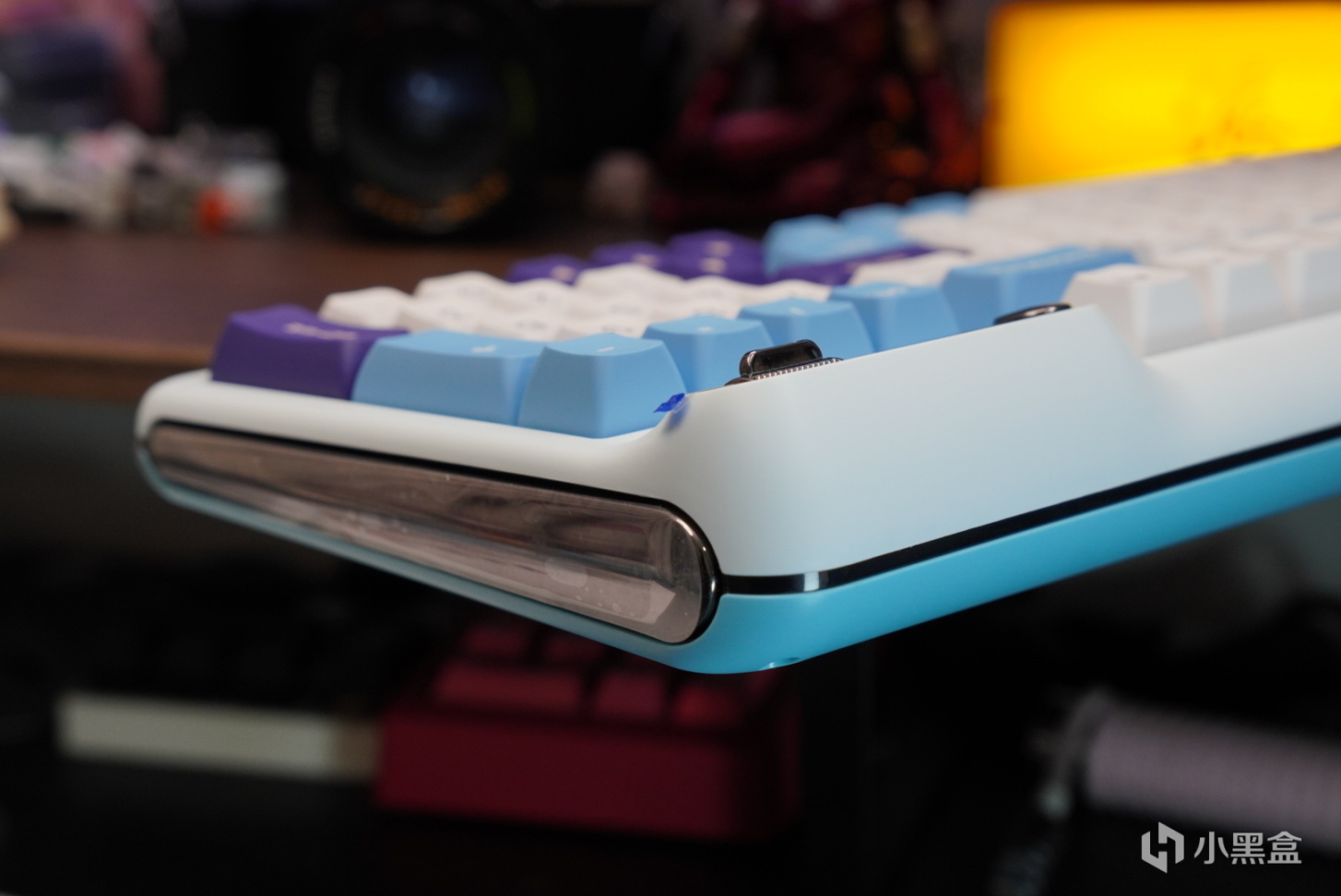 键盘侧边的装饰条是一个磁吸设计,这个啊我估计是可以让你自己更换的,但是啊,由于是磁吸上去的,摸起来还是有一定的移动空间