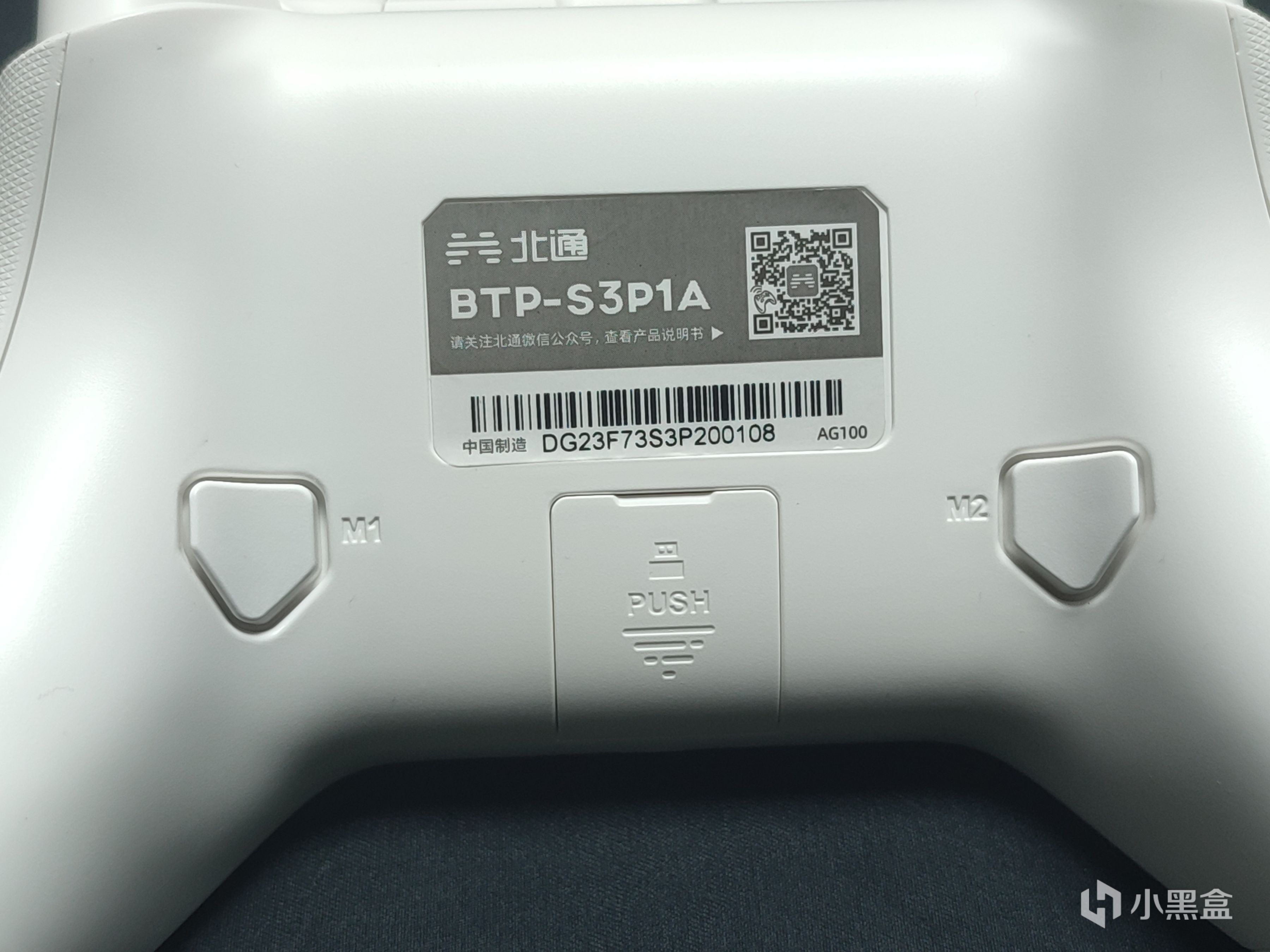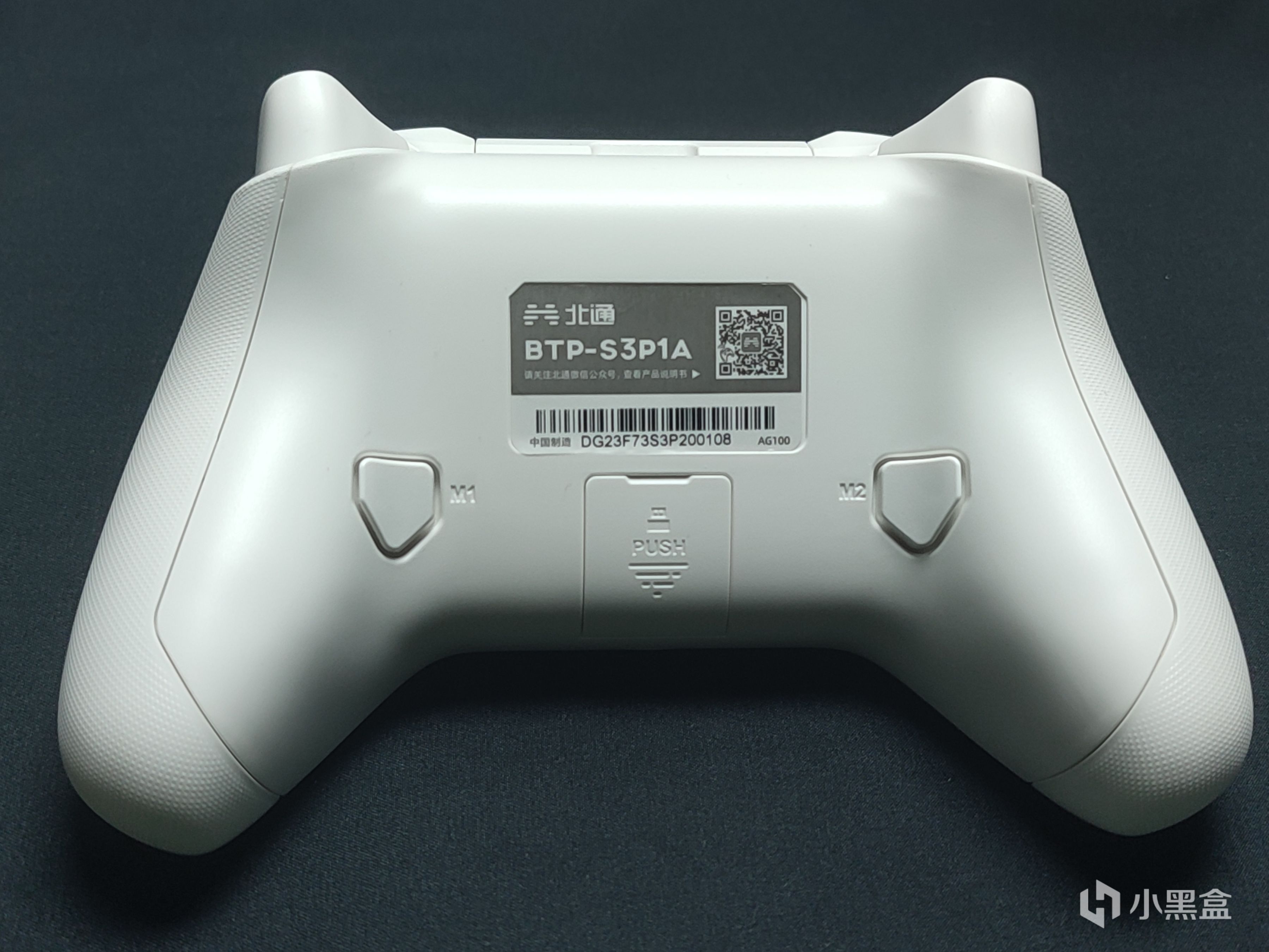 背面照例一张贴纸,不过北通这个贴纸内置一张二维码,扫了过后直达公众号,可以在线查询该产品的说明书还算不错,除此之外下方就是接收器收纳仓了,没错,斯巴达3除了有线以及蓝牙之外,还可以链接2.4G,稳定性方面比蓝牙更强。比较遗憾没能做成磁吸收纳,不过外面有盖子也确实无伤大雅。