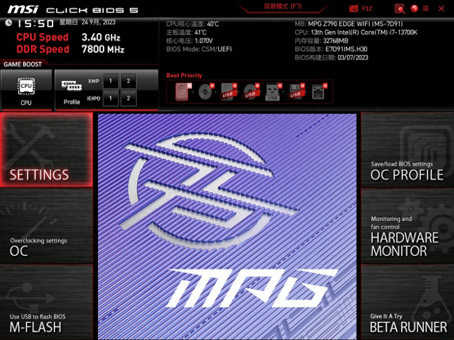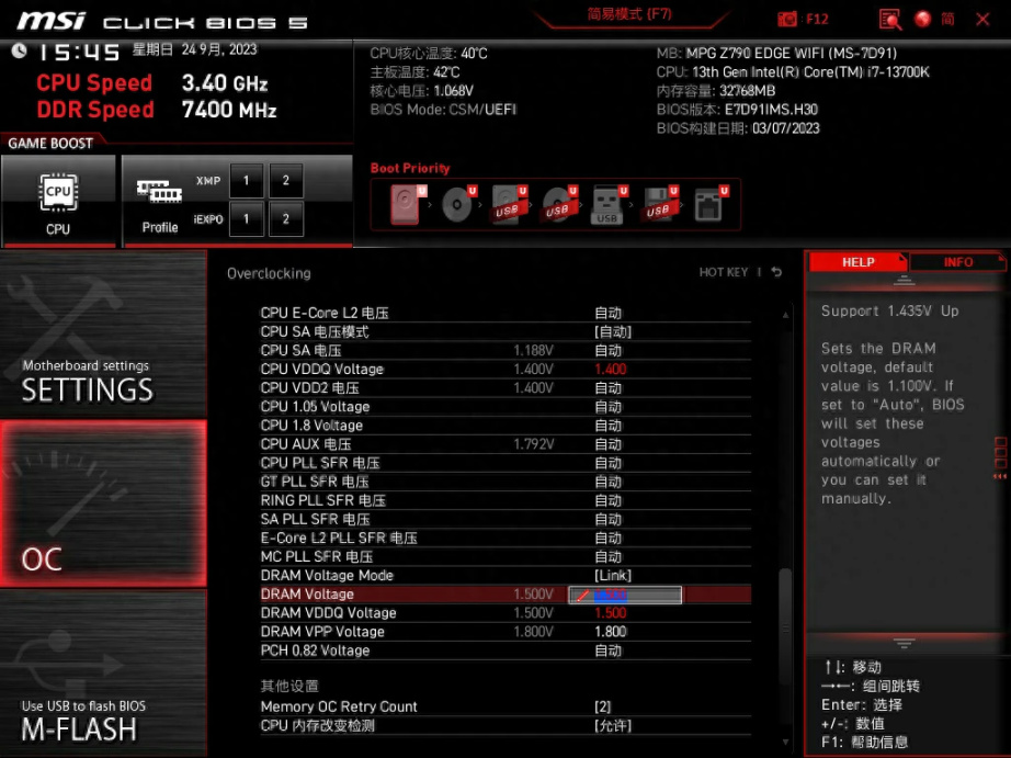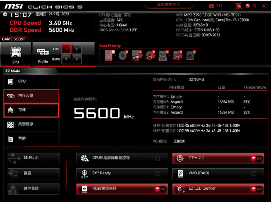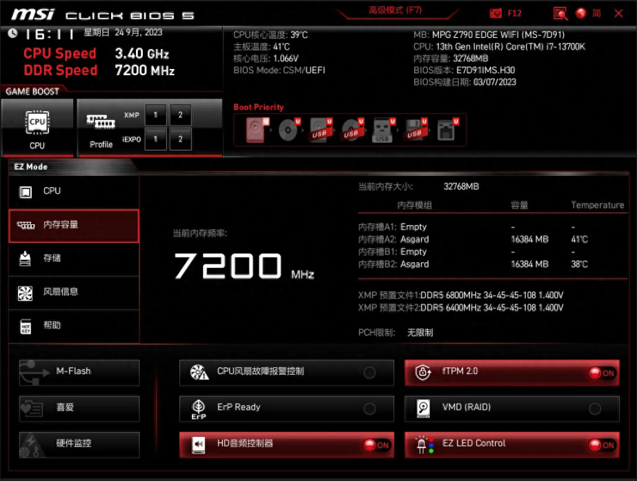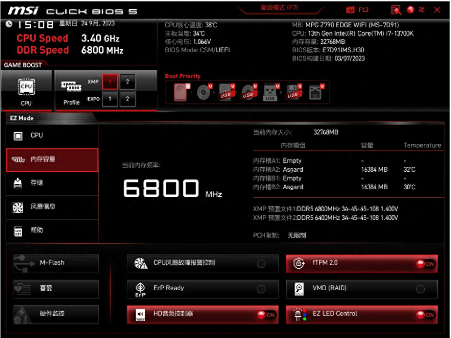 阿斯加特Asgard女武神瓦尔基里套装自带的XMP中提供6800MHz和6400MHz两套预设方案,对玩家来当然是选择前者了,微星790EDGE的XMP超频操作也非常简单,直接点亮左侧内存模块对应的XMP1方案即可实现自动超频。