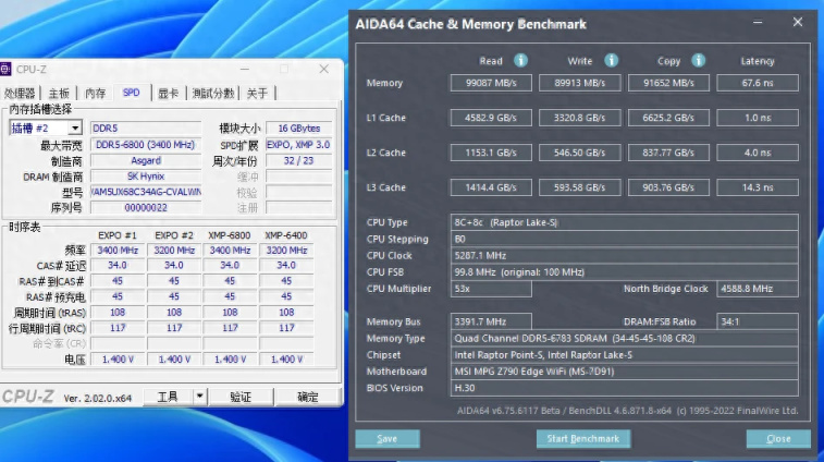 在内存测试中,这套阿斯加特Asgard女武神读写速度保持在99087MB/s,89913MB/s,延时67.6ns。
