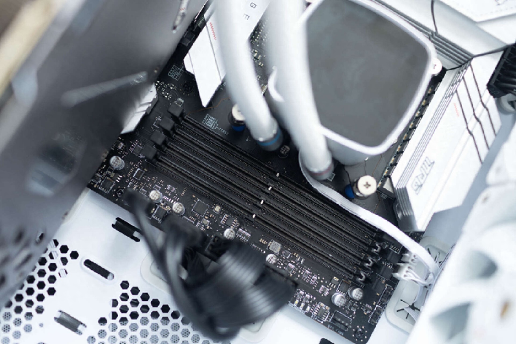 如果需要超频内存,官方推荐使用DIMM2和DIMM4的组合,这也是我选择16G*2套装的重要原因,安装内存后,从侧面看可以发现内存装甲的用料真的非常扎实,平整的内存装甲顶部也能兼容大型风冷散热塔,白色的套装也能更好的搭建出全白主机的效果。
