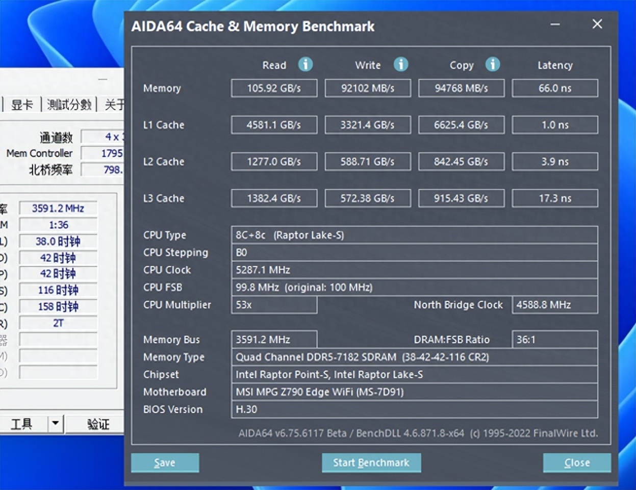 在7200MHz状态下,内存的读写得到了大幅提升,达到了105.92GB/s,92102Mb/s,延时方面也没出现太大的变化,66.0ns的表现相当让人惊喜。