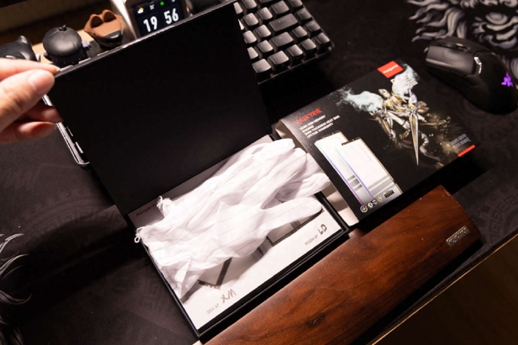 开箱过程类似打开首饰盒,官方甚至还提供了一双丝质手套。如果你想要满满的开箱仪式感,可以带上手套,再揭开覆盖在内存上的设计草稿,这样才能见到内存的真颜,一套操作,直接把玩家的开箱的心态拿捏住了。
