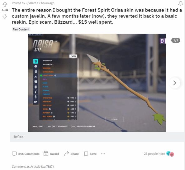 把奥丽莎林地之魂的皮肤中特殊的矛改版成初始皮肤的,引起玩家的不满