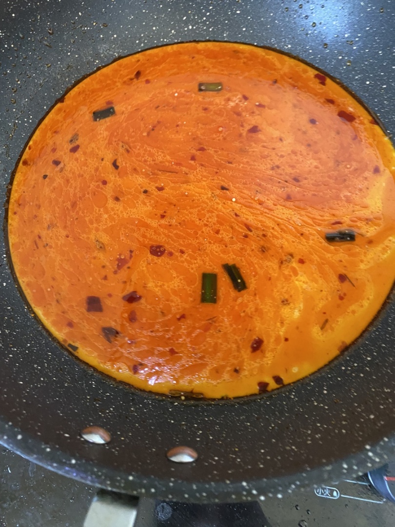 2.煸香后加入火锅底料和豆瓣酱翻炒