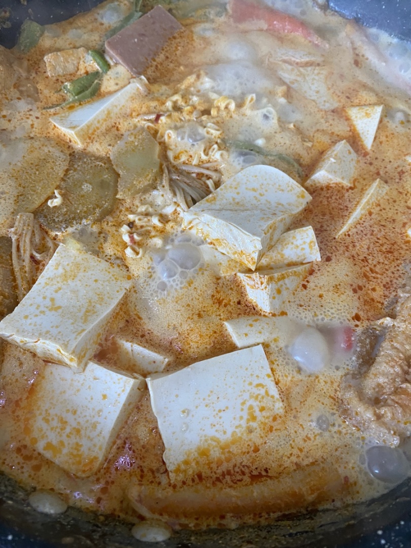 准备食材:麻辣烫喜欢吃的素菜荤菜,火锅底料,豆瓣酱,葱蒜,牛奶,芝麻酱。忘了拍照直接看过程吧食材需要提前煮个七八分熟