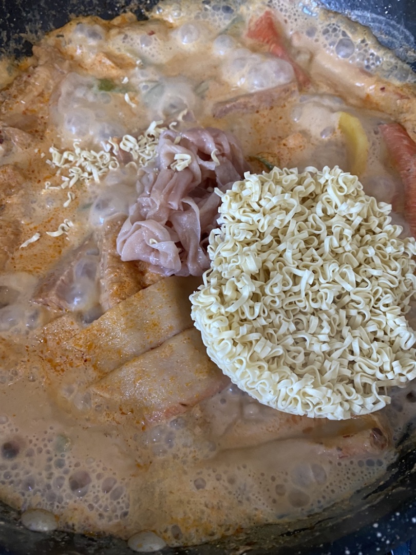 4.然后加入两人份牛奶,加入提前煮好的食材牛奶煮开需要把浮沫撇去