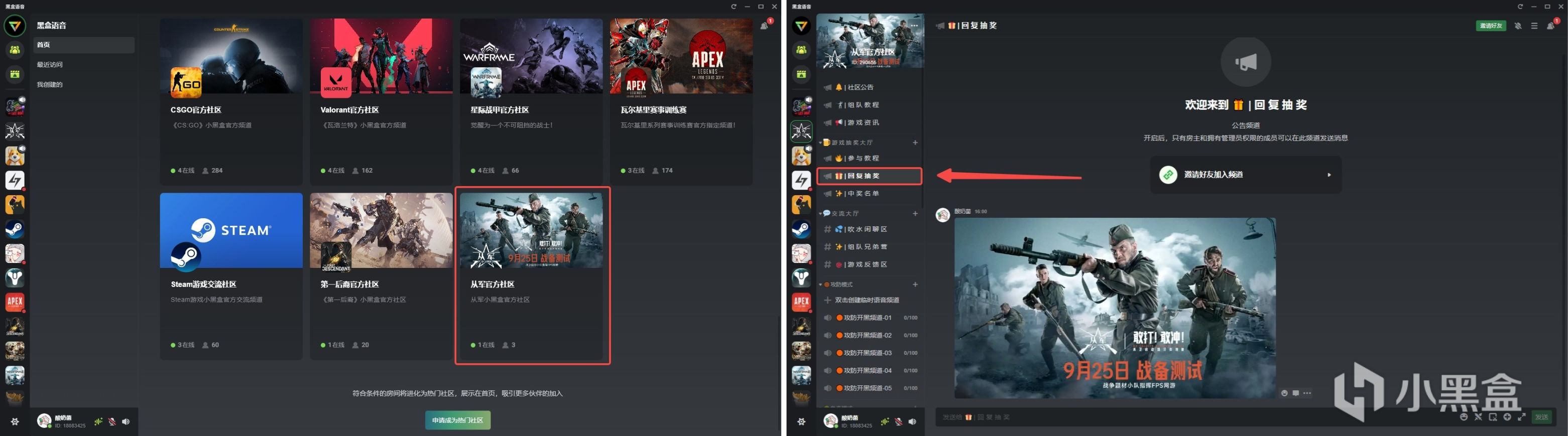 - 在9月25日与9月26日17:00前往「从军官方社区」的「回复抽奖」频道,对管理员发布的抽奖消息进行表情回应即可参与抽奖活动,抽奖活动持续至9月26日22:00。每位用户最多可获得一个奖品。中奖用户可前往黑盒语音-最近消息-系统消息领取。