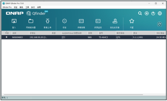 然后打开电脑端的Qfinder Pro应用,可以看到已经搜寻出来NAS了。注意NAS开机这个过程需要等1-2分钟。