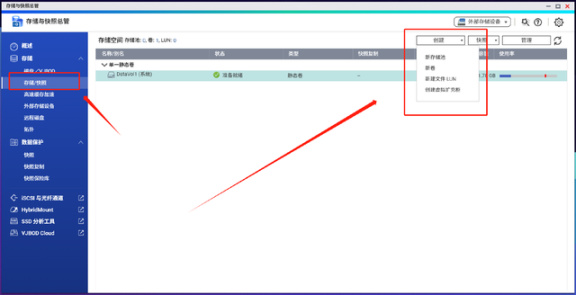 (2)首先选择左侧的“存储/快照”,再选择右上角的“创建”,有“新存储池”或“新卷”。请注意:如果需要“厚卷”和“精简卷”就选择“新存储池”,如果选择“静态卷”就选择“新卷”。