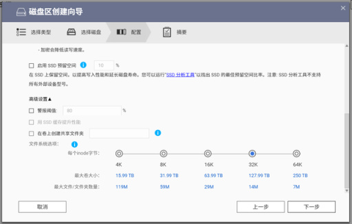 (6)是否启用SSD预留空间,选择否;然后打开高级设置,把警报临界值取消,这个没啥用。