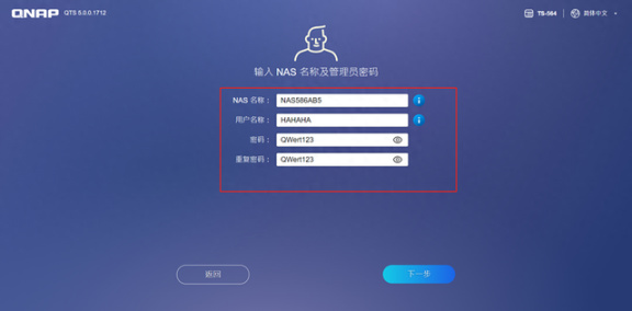 需要用户自己填写NAS的名称,账号名字,账号密码。注意:密码必须包括大小写和数字。