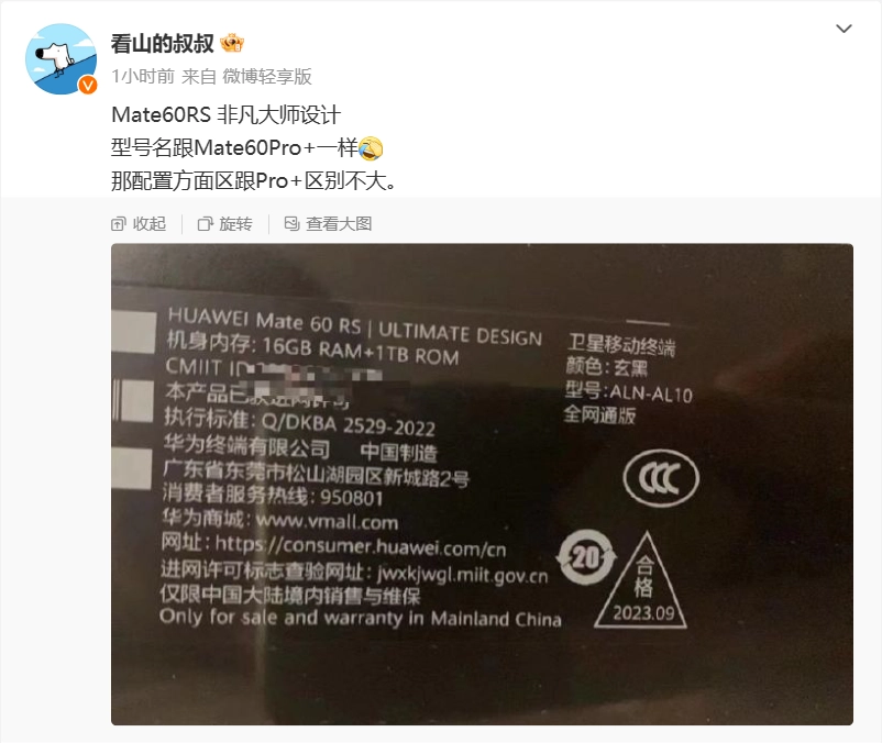 另一位博主 @看山的叔叔 曝光了华为 Mate 60 RS 的包装盒信息,并表示其配置与华为 Mate 60 Pro+ 区别不大,可以看出的信息有: