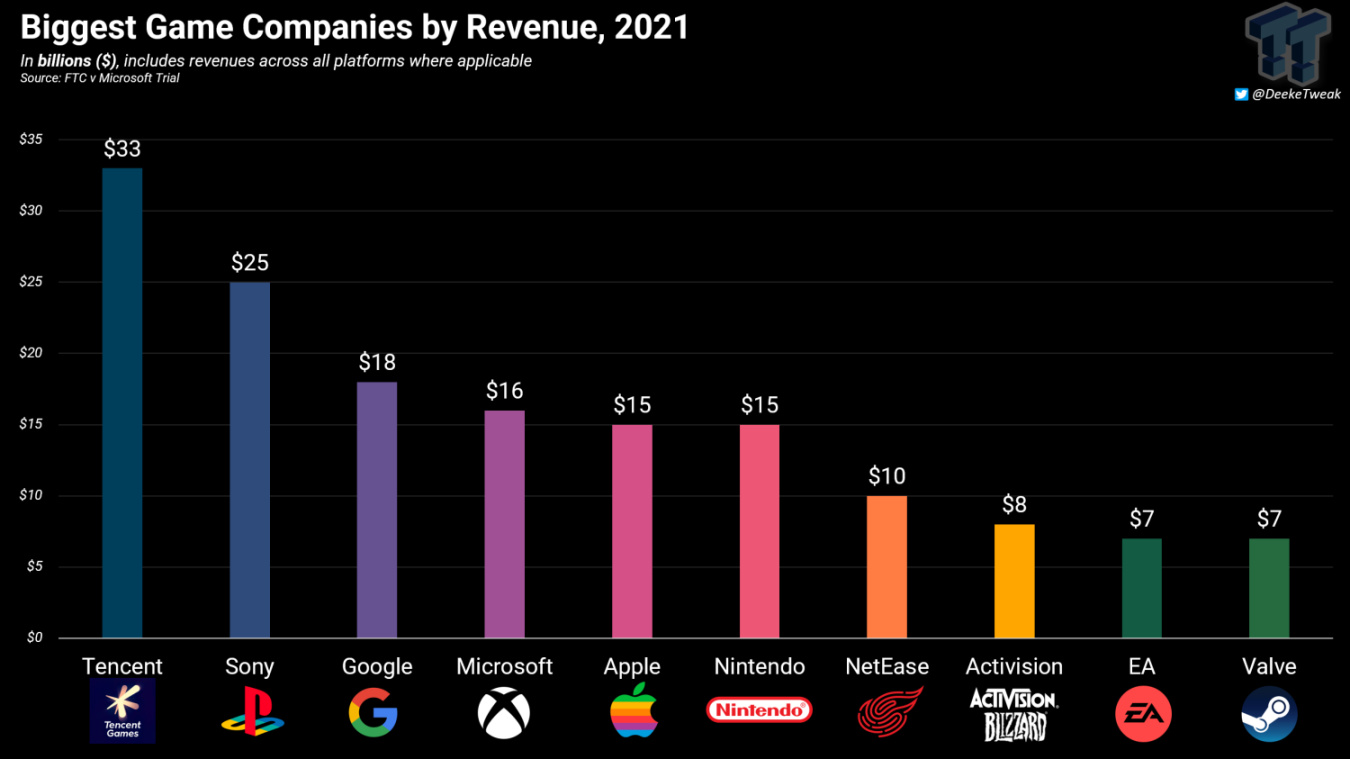 需要指出的是,以上信息并非100%准确的信息,因为大部分公司并不会透露他们的真实收入数据。上述数据是微软内部根据已知信息给出的,而像Valve(V社)这种完全未上市的公司,其收入数据基本都是猜的。不过,这些数据毕竟来自微软内部,还是有一定参考价值的。