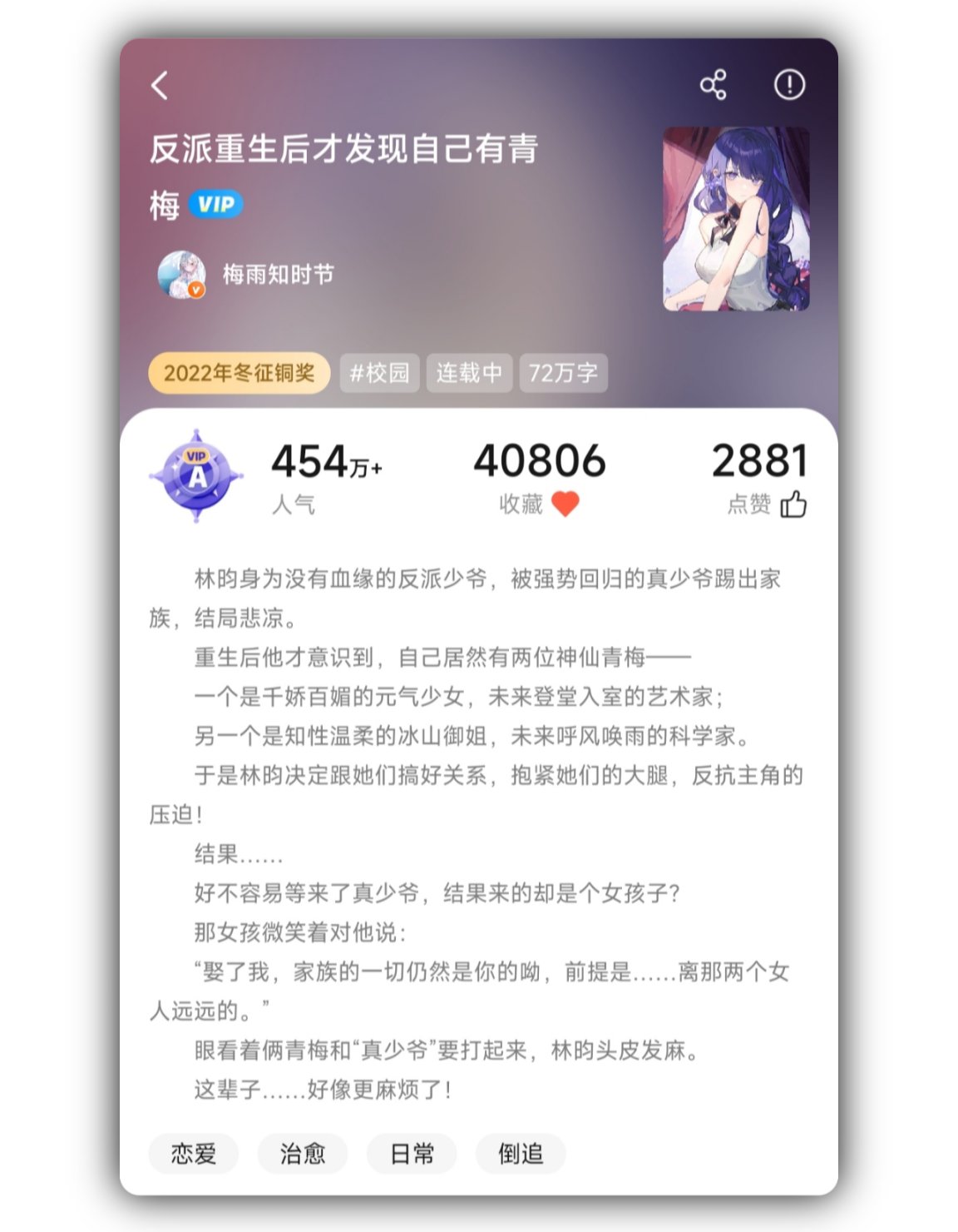 書名有個反派,好像是個反派文,主角是個反派,但其實跟反派沒多大關係……