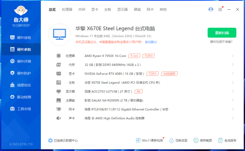 完整配置單:R9-7950X處理器、華擎X670E Steel Legend鋼鐵傳奇、影馳RTX4080 金屬大師OC顯卡、星曜X4 Pro 2T M.2固態硬盤、星曜D5-6400MHz 16G*2內存、微星M360 迫擊炮一體式水冷、安鈦克Performance1 FT初星全塔機箱、安鈦克NE 1000W 金牌全模組電源...市場行情應該在1.7W左右,僅供參考。