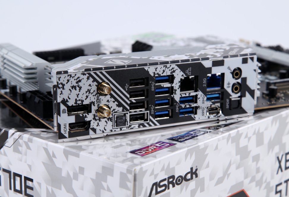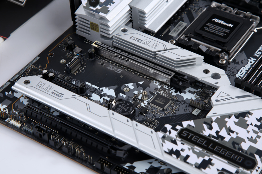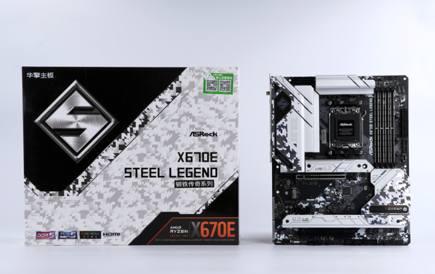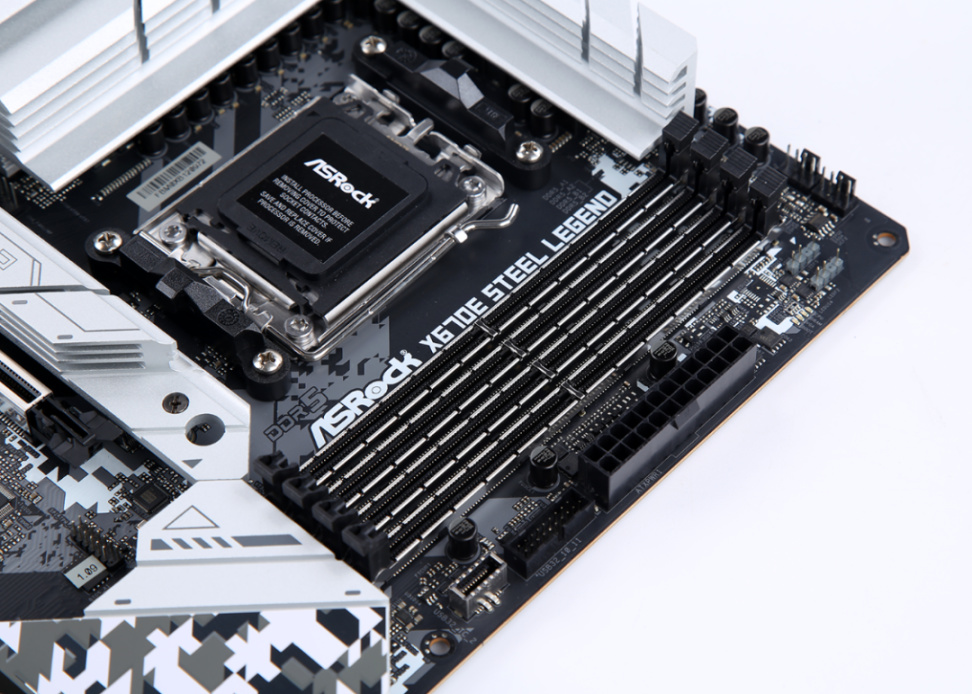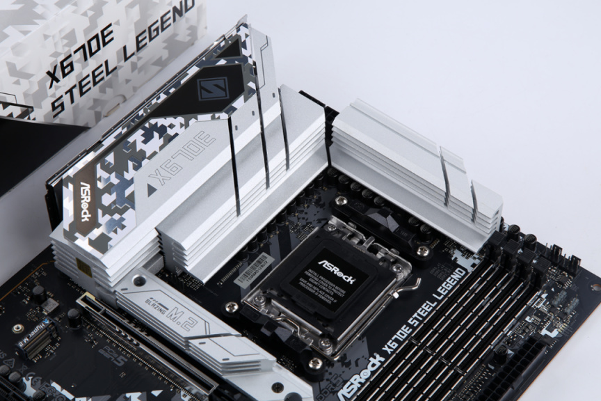 主板方面,當然也不能掉隊。選擇的是一塊來自華擎的X670E鋼鐵傳奇主板,ATX版型,8層服務器級PCB設計。外觀方面,黑色PCB表面覆蓋有大面積的高顏值金屬裝甲,迷彩白的配色,顏值直接拉滿。